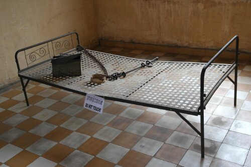 Some of the classrooms had been kept to their original size and were used to house dozens of prisoners lying on the floor, two rows meeting with their feet along the middle of the room from the back wall to the blackboard, feet shackled to an iron bar running the length of the room. The side walls were numbered, presumably each number representing a prisoner. No names or humanity allowed here.
