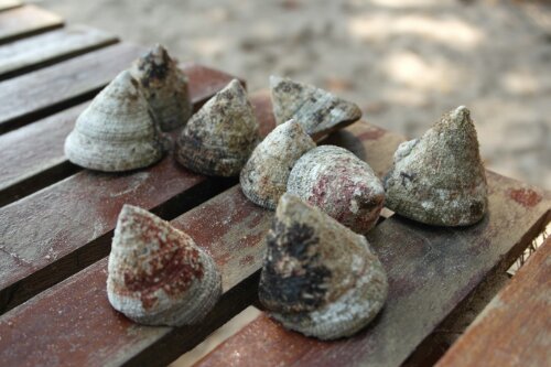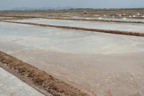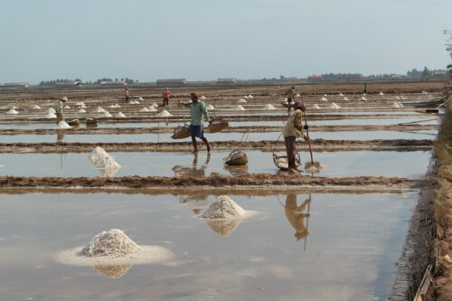 First we stopped off at a salt farm – never seen one of them before! The land was aub-divided into small rectangular areas, each with slightly raised edges of earth, and within each sea water was collected and left to evaporate leaving the grainy sea salt behind. I watched men and women, hunched over brushing the salt free of the land into heaps and then collecting their gains in bamboo baskets that they carried into the collection shed. It was a truly amazing sight.